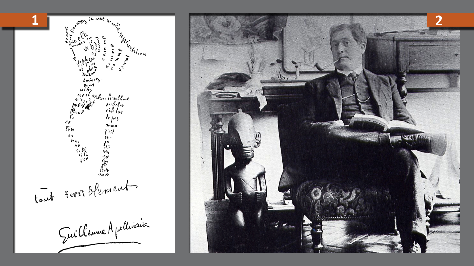 Guillaume Apollinaire (born Rome 1880, died Paris 1918) contributed to the creation of a more aesthetic vision of African artworks brought from the colonies, and notably exhibited his work in the ethnographic museum of the Trocadero in Paris. He wrote various articles on the subject. From 1909 to 1910, he also collected many African objects.