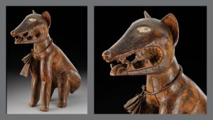 Their role was to protect the village from the evil spirits. Our power figure is a sitting dog with its mouth open, watchful, alert, protecting the surrounding area.