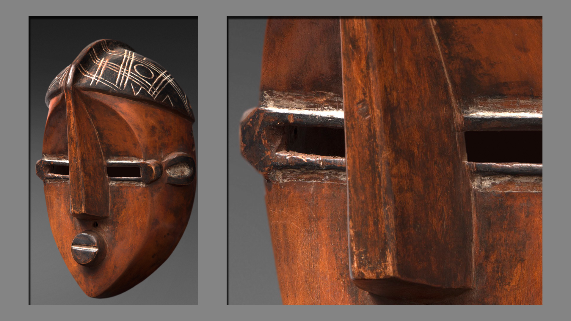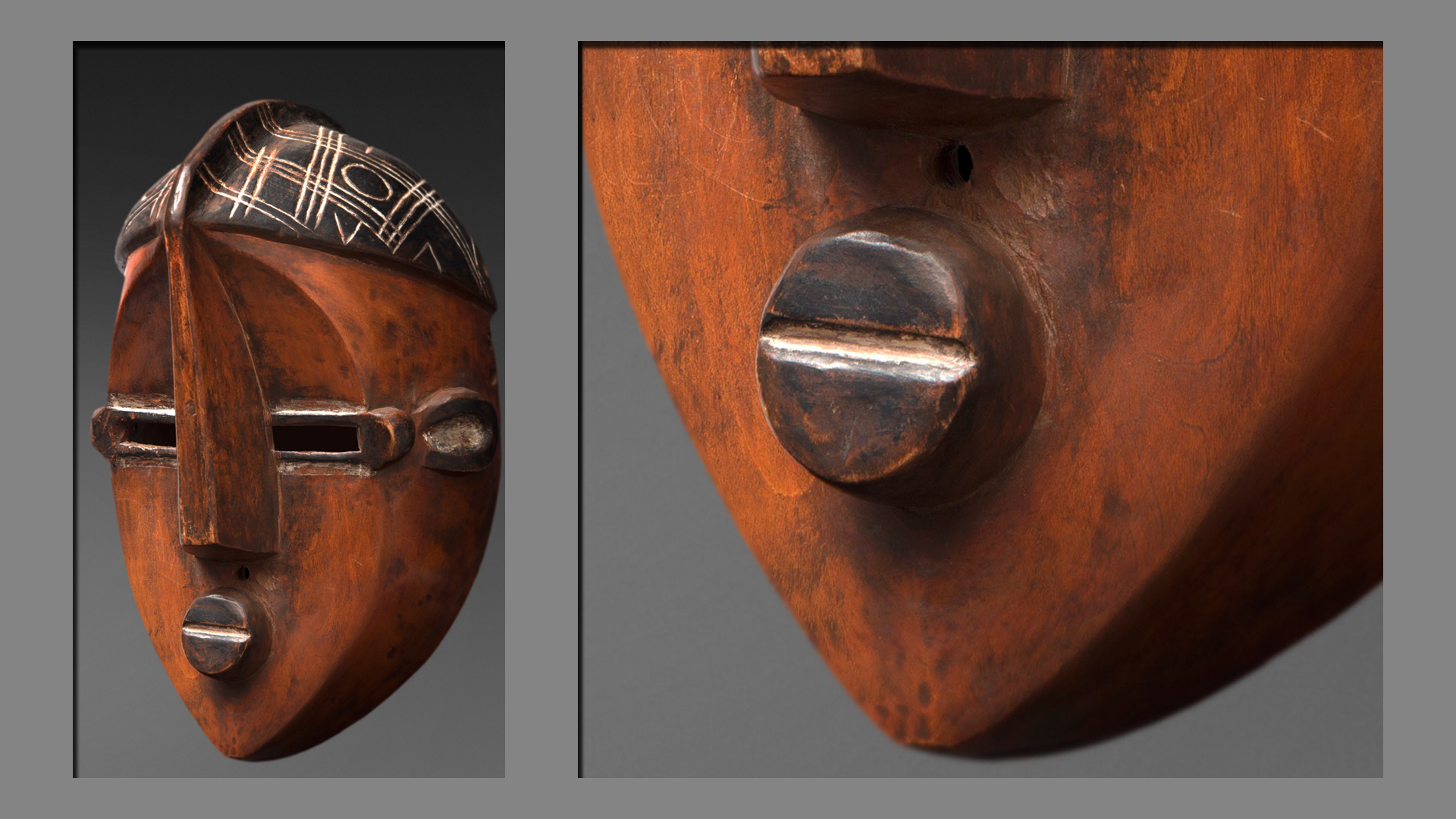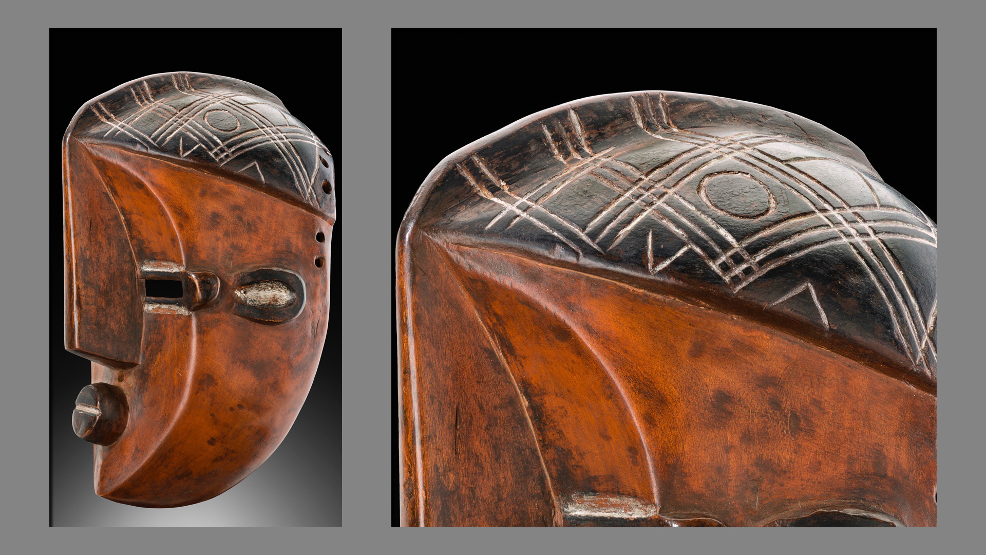 These are male masks with very distinctive shapes: the angular, protuberant crest of the nose goes from the lower part of the face to the back of the skull. Reminiscent of a bird, the mask thus mixes human- and animal-like elements (Ceyssens, in Tervuren, 1995, p. 328). The top of the mask, black in colour and delineated by a border at the top of the head, is decorated with white stripes.