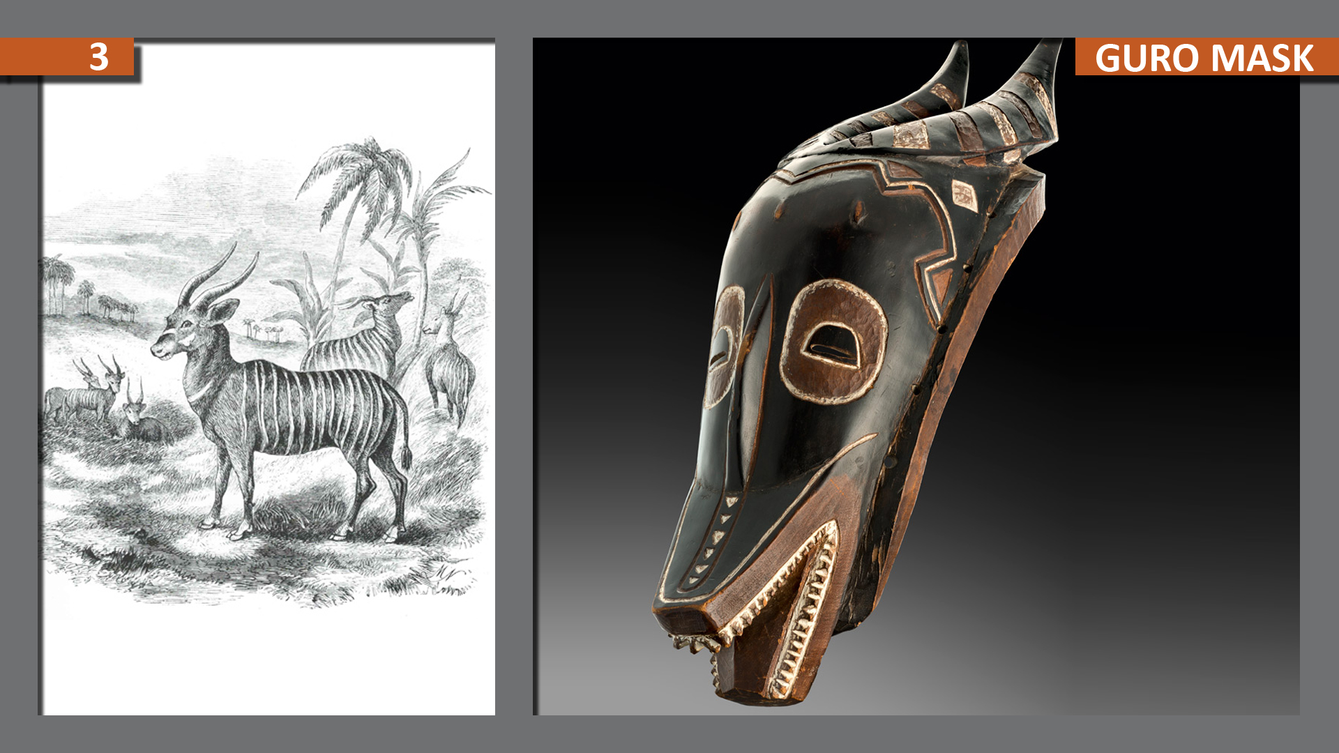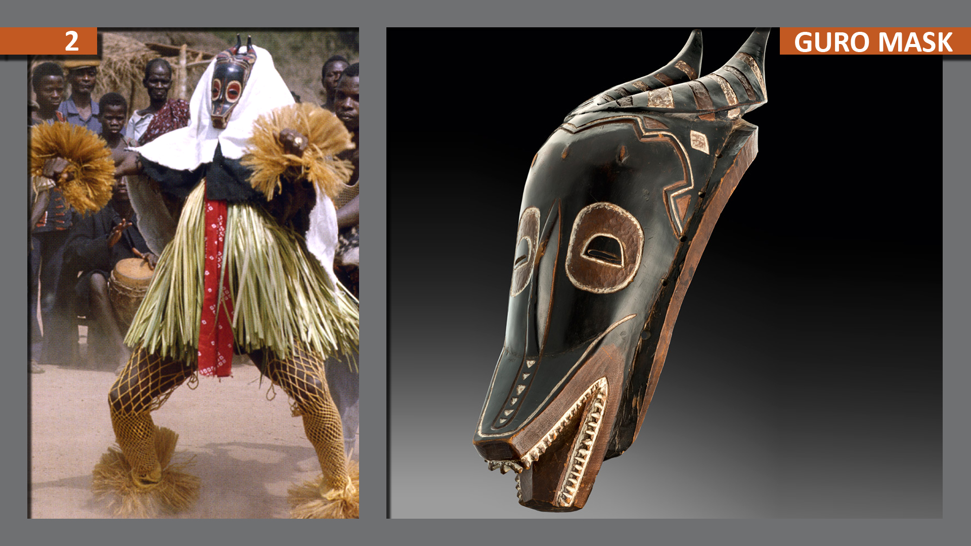 The Zamble appears with other masks; in competition with the Zaouli mask, an old man, coming from neighbouring villages, or with the Gu mask representing the wife of Zamble. Such masquerades are popular amusement in central parts of the country. And we can see the same kind of masks among the Yaure and Baule.